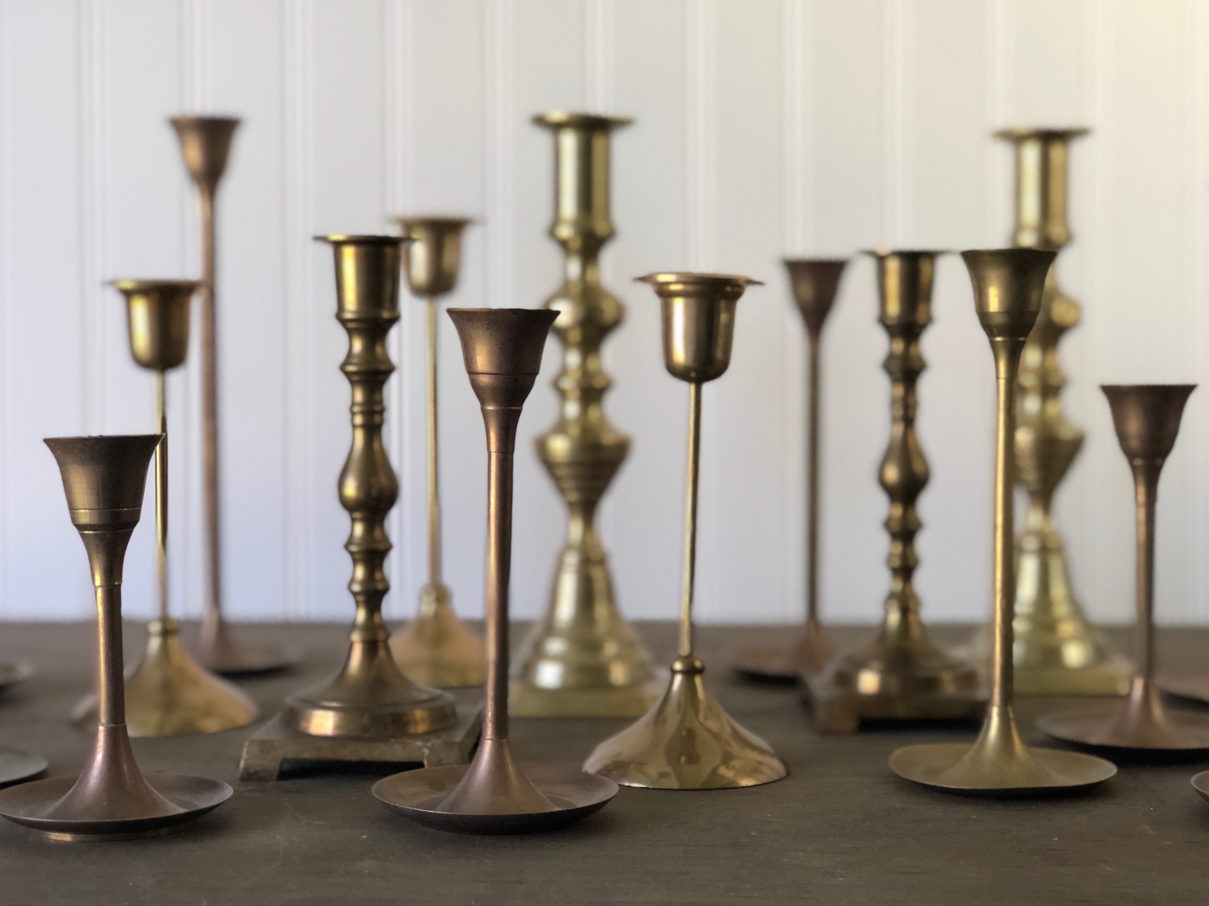 Assorted Brass Candle Holders create an eclectic centerpiece or as accent decor.