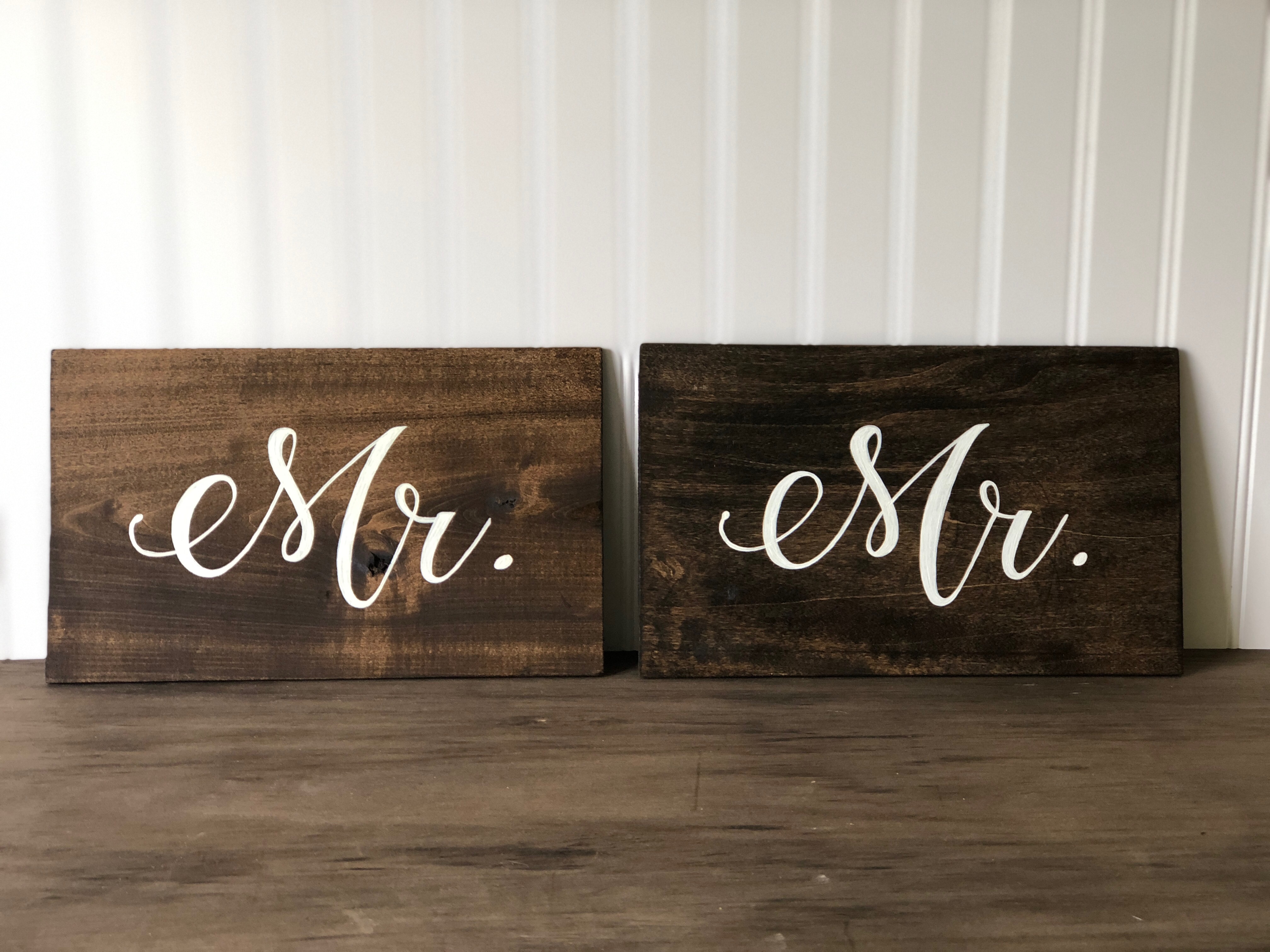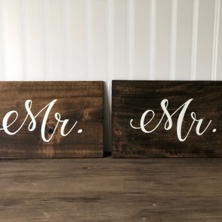 This set of hand painted Mr. & Mr. signs are the perfect touch to decorate your sweet heart table chairs.