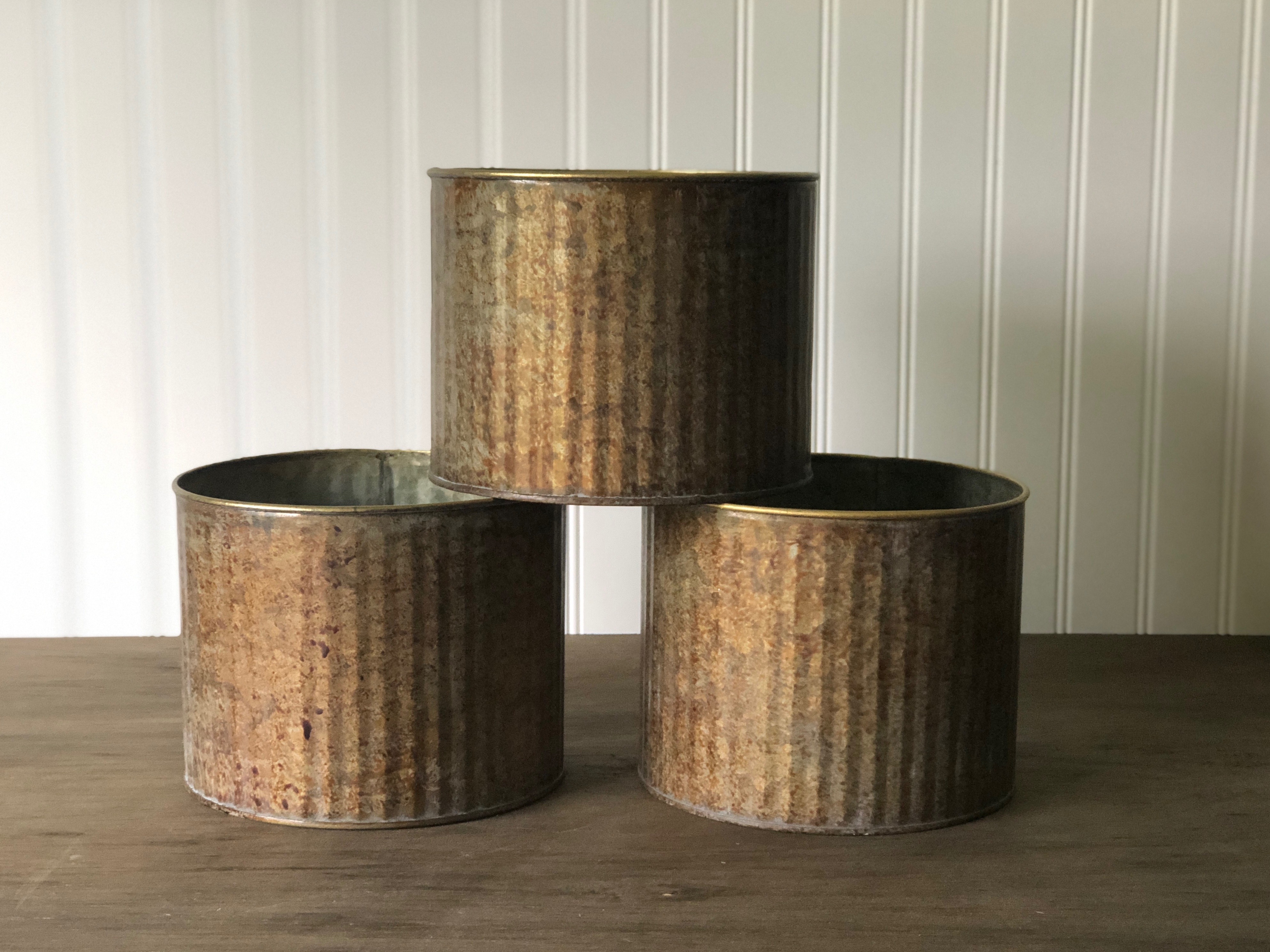 These rustic tins are lovely addition to a table scape filled with greens or pretty floral arrangements.